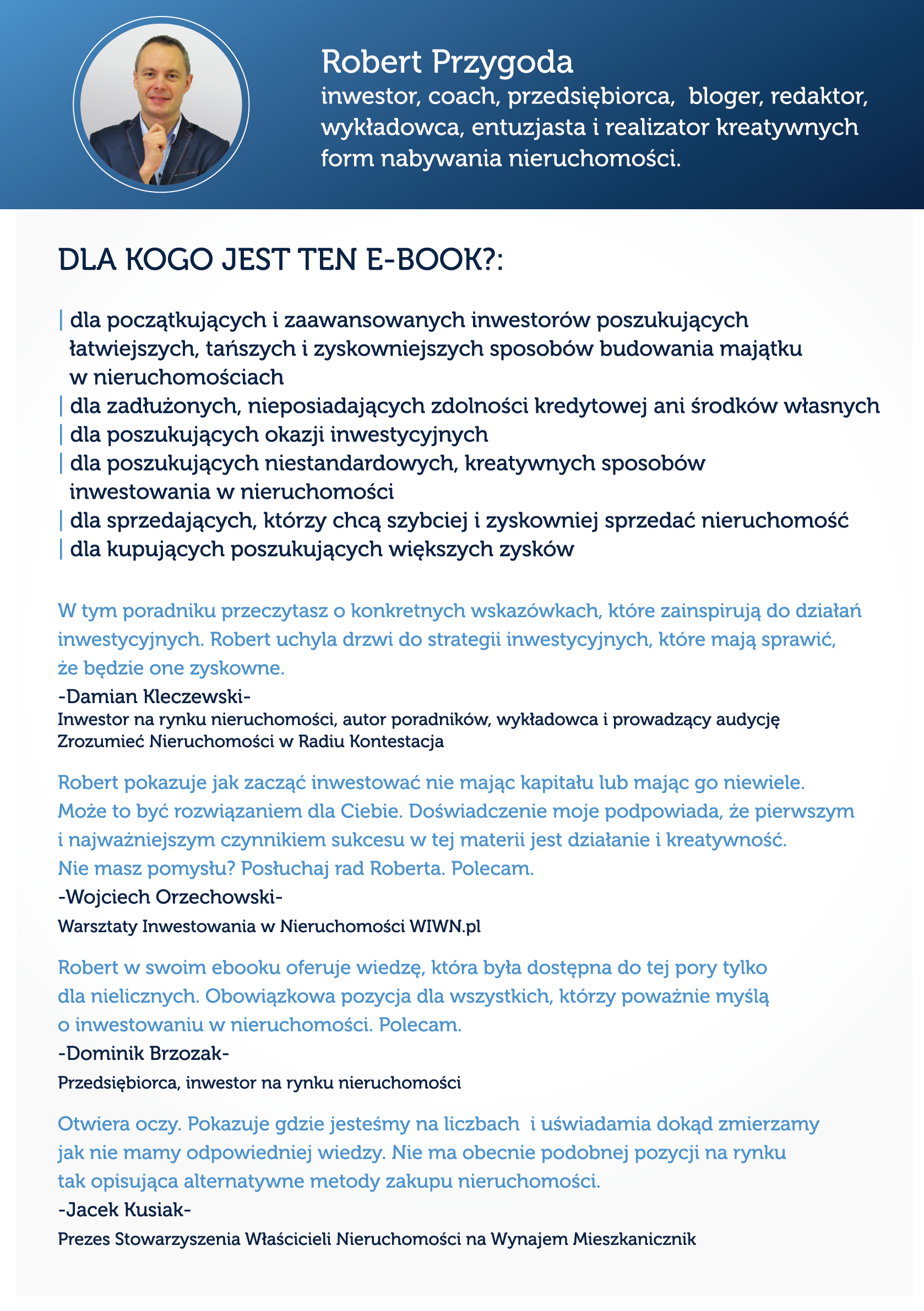 – dla początkujących i zaawansowanych inwestorów poszukujących łatwiejszych, tańszych i zyskowniejszych sposobów budowania majątku w nieruchomościach